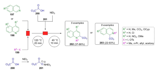Lindhardt et al. developed a methodology to obtain isoquinolines and quinolines via a decarboxylative Reissert-type reaction through a continuous flow [43]. Isoquinolines 197 or quinolines 198, triethylammonium trichloroacetate (201), and electrophilic iodides or tosylates 199 were combined in neat DMF or a mixture of DMF/ MeCN under continuous flow afforded dihydroquinolines 202 or dihydroisoquinolines 203 in moderate to good yields (up to 93 %) (Scheme 30). N-alkylations were carried out with different types of alkylic chains. 4-Addition was promoted by trichloromethyl anion to afford the products 202. On the other hand, alkyl iodides or allyl tosylates promote the corresponding alkylations to give the products 203.