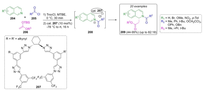 García-Mancheño et al. used a chiral triazole-based organocatalyst to synthesize some new Reissert-type dihydroisoquinolines (Scheme 31) [44]. After optimizing reaction parameters, a sequential combination of isoquinolines204, acid chlorides 205, and silyl ketene acetals 206 in methyl tert-butyl ether (MTBE), catalyzed by the triazole-containing organocatalysts 207 resulted in the synthesis of isoquinolines 209 in moderate to good yields (up to 99 %) and good enantioselectivity (up to 82:12 (R/S). The use of chiral-triazole through anion-binding activation and MTBE as solvent had a strong influence on the enantioselectivity. 1H-1,2,3-triazoles are excellent H-bond donors due to the high polarizability of their C-H bond and the acidity at the C-5 position. In addition, triazole catalysts exhibit chloride counterion binding, which results in chirality transfer. This type of catalysis is most efficient in the case of counterion catalysts with halogen-halogen interactions [45].
