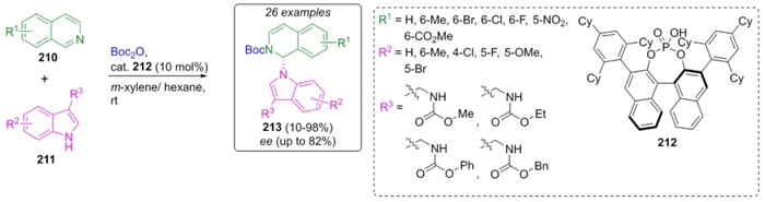 You et al. developed an asymmetric N-alkylation of indoles via a Reissert reaction (Scheme 32) [46]. Thus, once the optimal reaction conditions were identified, a sequential combination of isoquinolines 210, indoles 211, and protective group reagent Boc2O catalyzed by the chiral phosphonic acid 212 in the solvent mixture (m-xylene/hexane) at room temperature allowed the synthesis of compounds 213 in good to excellent yields (up to 98 %) and with moderate to good enantioselectivities (up to 82 %) as (R) absolute configuration. Indole alkylation occurred in the N-1 position assisted by the catalyst. The best yields and enantioselectivities were obtained when the reaction occurred at position 2 of the isoquinoline ring, which is due to steric hindrance at the other reactive positions.