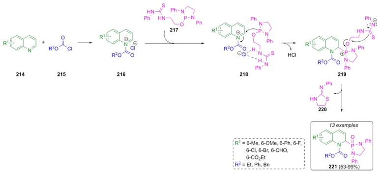 Kang et al. reported the synthesis of a series of new quinolinyl phosphonamides via a Reissert-type reaction (Scheme 33) [47]. A plausible mechanism involves the formation of quinolinium salts 216 through a mixture of quinolines 214 and chloroformates 215. Thus, thiourea 217 reacts with quinolinium salts 216 to give the salt-complexes intermediates 218. Finally, an intramolecular nucleophilic attack on intermediates 219 occurs to release cyclic compound 220, achieving the products 221 in moderate to good yields (53-99 %). The salt-complexed thioureas 218 as Brønsted acids promote 1,2-regioselective additions of the phosphine moiety through a ion paring process between chloride and thiourea fragments.