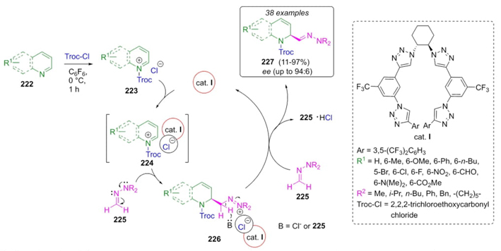 In 2021, García-Mancheño et al. developed a robust strategy to synthesize 2-hydrazone-1,2-dihydroquinolines 227 via a Reissert-type reaction using a triazole-containing organocatalyst and dimethylhydrazone as the nucleophile with reversed-polarity [48]. The best reaction conditions were employing CF3-tetrakistriazole as the catalyst and hexafluorobenzene as the solvent at low temperatures. Thus, quinolines 222, trichloroethoxycarbonyl chloride (Troc-Cl), and formaldehyde dimethylhydrazones 225 were reacted together to give the products 227 in moderate to good yields (11-97 %) and enantiomeric ratio (er) up to 94:6 (Scheme 34). It was proposed a plausible mechanism in which quinolinium salts 224 and 226 were formed after a chloride activation with Troc-Cl to give intermediates 223. Then, the later were activated through an anion-binding catalysis. Finally, a nucleophilic attack of the hydrazones followed by deprotonation afforded products 227. It is to highlight that the use of hexafluorobenzene as the solvent and tetrakestriazole as the organocatalyst promoted a high regio- and chemoselectivity through anion-binding strategy; which is probably due to the presence of triazoles-CF3 moieties as a key fragment in the organocatalyst, as discussed above.