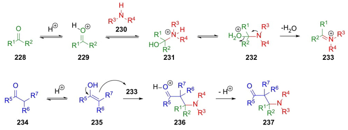 Around 1917, Carl Mannich reported a 3CR that consists of the combination of a non-enolizable carbonyl compound (usually aldehyde or ketone), a primary or secondary amine (even ammonia), and an enolizable aldehyde or ketone to access β-amino carbonyl compounds. A mechanism accepted begins with the formation of oxoniums 229 through protonation of carbonyl compounds 228. Then, addition of amines 230 to give species 231 which after prototropic exchange achieve intermediates 232, and the formation of iminium ions 233 through water release. Besides, carbonyl compounds 234 perform corresponding enols 235. Then, a nucleophilic attack from enols 235 to iminium ions 233 achieved oxonium salts 236. Finally, a proton releases complete formation of alkaloid-type compounds 237(Scheme 35) [49]. This procedure can also be carried out as intramolecular manner [50]. The asymmetric version of this process could be catalyzed by organic and inorganic complexes. This reaction has been applied successfully for the synthesis of several natural products, even some alkaloids [51].