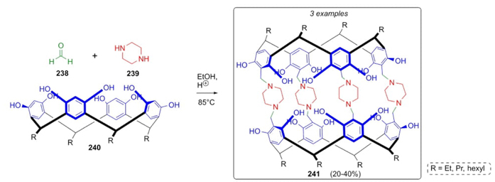 Rissanen et al. developed a one-pot synthetic approach based on the Mannich reaction to synthesize three complex macrocycles 241 [52]. Formaldehyde (238) in solution of ethanol was combined with piperazine (239) and cyclic tetrabenzoxazines 240 to assemble the macrocyclic dimers 241 in modest yields (20-40 %) (Scheme 36). Piperazine links both moieties through covalent bonds giving rigidity to these supramolecules. Despite the size of the compounds, the yields were moderate highlighting that the one-pot process was favored by the solvent being encapsulated on cage structures.