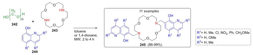 Aza crown-ether-derivatives have been utilized as fluorescent sensors in different biological targets. Lombardo, Trombini et al. synthesized eleven new diaza crown-ethers via a Mannich one-pot process using microwave radiation as a heat source [53]. Paraformaldehyde 242, and the crown-ether 243 were combined sequentially with 8-hydroxyquinolines 244 reaching ligands 245 in good yields (86-99%) via a microwave-assisted Mannich-type 3CR (Scheme 37). It is important to highlight the high atom economy of this innovative experimental protocol. Also, microwave-assisted catalyst-free conditions decreases the formation of by-products. Strategic substituents at positions 2, 4 and 5 in isoquinoline moiety contributed to higher yields due to a high activation on such ring.
