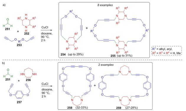 Coined for the first time by C.-J. Li, the A3 coupling is a 3CR of amines, aldehydes, and alkynes to synthesize propargyl amines. [55]. This coupling, which is characterized by its high atom economy and ecofriendly conditions, is commonly applied for the formation of several kind of N, O, and S-heterocycles [56]. In 2011, Wu et al. reported an interesting methodology to generate macrocycles via a Mannich reaction based on an early A3 coupling [57]. Thus, a copper(I)-catalyzed sequential combination of formaldehyde (251), polysubstituted piperazines 252, and dialkynes 253 gave the macrocycles 254 and 255 in moderate yields (29-31 %) (Scheme 39(a)). In addition, another Mannich-type 3CR coupled to an Eglinton-Glaser dimerization was performed (Scheme 39(b)) by using formaldehyde (251), 1,4-diazepane (256), and aryl-dialkynes 257 to give the macrocycles 258 and 259. Both terminal dialkynes 253 or 257 fulfilled the double function in the Mannich reaction and dimerization process. Also, these kind of reactions proceed correctly using secondary amines, which is not common.