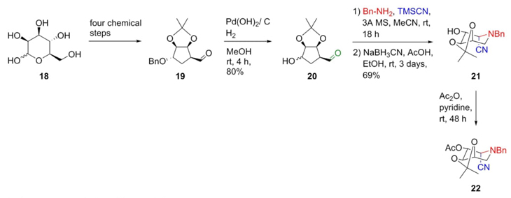 Another nice example of a Strecker reaction is found in a report by Cardona et al. [13]. Aldehyde 19 was previously prepared starting from D-mannose (18) in four steps (Scheme 4). Then, a catalytic hydrogenation of ketal 19 was performed to give the aldehyde 20, which then was subjected to a Strecker reaction in mild conditions using benzylamine and trimethylsilyl cyanide. Finally, nitrile 21 was acetylated under basic conditions affording the piperidine-containing acetate 22. Noteworthy, Strecker reaction was the step key as stereo and regio-selective due to the following reasons:1) it was taken the stereochemistry of compound 20 to carry out the Strecker reaction, where the formation of the iminium ion favored a chelated intermediate in which the cyanide anion performed the addition on the Si face to the double bond forming the diastereomer S as the major product. In the same way, reductive amination at the C-1 position was promoted by the C-5 position of aldehyde.