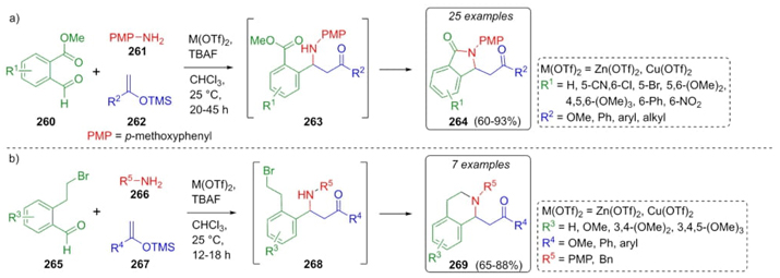 In 2015, Singh et al. reported an interesting procedure to synthesize a new series of isoindolinones and tetrahydroisoquinolines via a domino Mukaiyama−Mannich lactamization/alkylation process [58]. Thus, to synthesize the isoindolinones 264, the methodology was optimized using metal triflates as catalysts and electron-donor-acceptor substituted benzaldehydes 260 and amine 261, finding that electron-withdrawing amines do not promote such reaction. In the same way, o-anilines do not allow the corresponding isoquinoline formation due to steric hindrance (Scheme 40(a)). Thus, the same strategy was improved to assemble the corresponding tetrahydroisoquinolines 269. Thus, the combination of aldehydes 265, amines 266, and silyl enol ether- derivatives 267 catalyzed by Lewis acids achieved the products 269 in moderate to good yields (65-88 %) (Scheme 40(b)). To note, a decrease in reaction time was found for the synthesis of tetrahydroisoquinolines 269 probably due to a higher reactivity of intermediates 268 in comparison to intermediates 263.