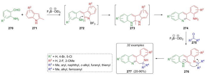 Gu et al. reported a procedure to synthesize the quinoline-fused 1‑benzazepines 277 via an intramolecular Mannich 3CR [59]. Thus, o-aminobenzaldehydes 270, indoles 271 as the nucleophile/amine-containing components, and ketones 275 were sequentially combined using a Lewis acid catalyst to give the benzo-annulated species 277 in moderate to good yields (20-90 %) (Scheme 41). The most plausible reaction mechanism involves the formation of intermediates 272 followed by nucleophilic attack at C2 position on the indole ring to give cyclized intermediates 273. Then, a ring-opening achieved compounds 274. Finally, compounds 277 were achieved through intramolecular cyclizations of activated enamines 276. A wide range of electron-donating and electron-deficient groups was included in the substrate scope. Even bulky groups such as ferrocene and cyclooctanone gave moderate yields. Formation of C, N-bis nucleophile intermediates 274 through a combination of aldehydes 270 and indoles 271 was the key step in this strategy.