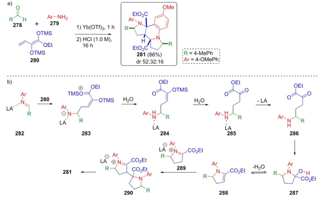 In 2018, Schneider et al. developed a synthetic procedure to obtain dipyrroloquinolines via a Mukaiyama−Mannich reaction [60]. The strategy involved a key mixture between the Lewis-acid activated imines 282 and a bis(silyl) dienediolate 280, which after a few steps gave the products 281 (Scheme 42). To carry out this synthesis, it was achieved a three-component reaction through sequential combination of aldehydes 278, amines 279, and TMS-dienediolate 280 under catalysis with Ytterbium (III) in acid medium to give a diastereomeric mixture (52:32:16) of products 281 in good chemical yield (86 %). The Lewis-acid catalyzed imines 282 and dienediolate 280 furnished desilylated enol ethers 283which after the addition of water performed compounds 284 and 285 and release of Lewis acidafforded the keto esters 286. Then, it was promoted an intramolecular cyclization to furnish compounds 287 in equilibria with compounds 288. Finally, it was carried out the Mannich reaction followed by Pictet-Spengler cyclization. In this strategy, several C-C and C-N bonds were formed with excellent stereoselectivity using both Brønsted and Lewis acids, where Brønsted acids enhanced better the stereoselectivity. DFT-based calculations by using the functional M06-D3 at LACVP**/PBF level of theory support the proposed mechanism.
