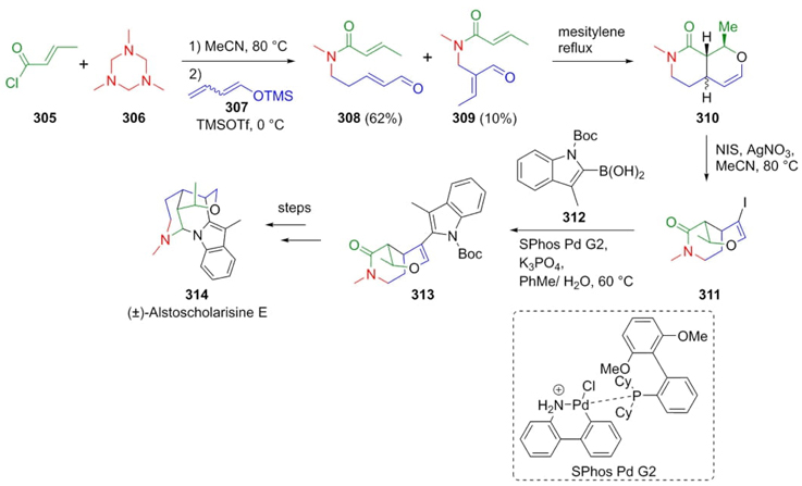 Martin et al. achieved the total synthesis of (±)-Alstoscholarisine-E (314) in seven steps with high stereoselectivity employing a vinylogous Mannich-type reaction as the initial key process [63]. Thus, acid chloride 305 and triazine 306 were combined in a solution of acetonitrile at 80 °C affording the in situ formed N-acyliminium ion, to which protected diene 307 was added to provide regioisomeric amides 308 and 309 in 62 % and 10 % yield, respectively (Scheme 45). Subsequent transformation of such compounds included a hetero-Diels-Alder cycloaddition, stereoselective enol ether reduction, a Suzuki-coupling, and a Lewis acid-catalyzed reduction. The three-component vinylogous Mannich reaction had a key role in this creative and short total synthesis of the natural product 314.