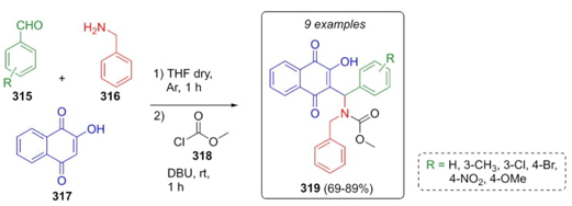 Forezi, Robbs et al. reported the synthesis of nine new naphthoquinones via a Mannich one-pot reaction, and their evaluation against oral squamous cell carcinoma was conducted [64]. Aromatic aldehydes 315, benzylamine (316), and hennotannic acid (317) also known as lawsone were combined sequentially at room temperature (Scheme 46). Then, DBU and methyl chloroformate (318) were added to obtain the naphthoquinone derivatives 319 in moderate to good yields (69-89 %). Also, dialkylated products were also obtained but changing the base by K2CO3. Naphthoquinones reported exhibited potential activity for preclinical trials against oral squamous cell carcinoma.