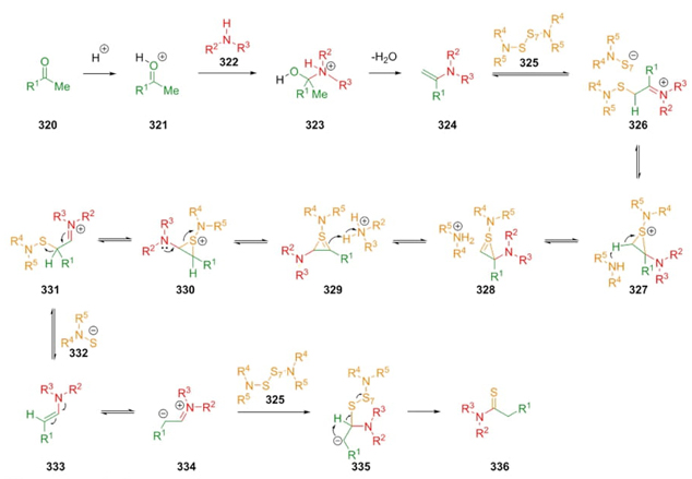 In 1887 (C. Willgerodt) and in 1923 (K. Kindler) the reaction between carbonylic compounds, disulfide compounds (or elemental sulfur), and secondary amines was developed, and later named asWillgerodt-Kindler reaction. In its classical version, this kind of one-pot process involves combinations of a carbonylic compound (aldehydes or ketones), elemental sulfur, and amines. Other non-carbonylic (or unsaturated) reactants such as imines, amines, alkenes, alkynes, or acetals may be used in these kinds of reactions [65]. In 1989, M. Carmack reported the mechanism in which the main steps consisted in the formation of enamines 324 between ketones 320 and amines 322 in acid media. Then formation of iminium ions 326 through reaction of enamines 324 and amino-sulfur compounds 325. Thus, it were performed annulated intermediates through a set of thiirene-type rearrangements 327 to 330 to achieve enamines 331.Finally, an oxidation on compound 333 in equilibria with 334 promoted by sulfur-containing reagents 325 afforded the products 336 (Scheme 47) [66].
