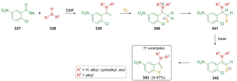Androsov et al. reported a strategy based on the Willgerodt-Kindler reaction to synthesize 3-amino benzo[b]thiophenes. Thus, acetophenone 337, amines 338, and elemental sulfur were mixed obtaining the products 343 in modest to good yields (4-47 %) [67]. A plausible mechanism of reaction was proposed (Scheme 48). Enamines 339 were formed by condensation of ketone 337 and amines 338, and the sulfur-was added to give the intermediates 341. Finally, the ring closure step took place by a nucleophilic substitution on intermediates 342 assisted by the nitro group, which activates its para-position substituted by the chlorine atom. Yields may be affected by the steric hindrance of the secondary bulky amines and low temperatures.