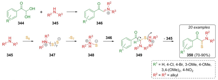 In 2013, Eftekhari-Sis, Büyükgüngör et al. reported the first Willgerodt-Kindler reaction using arylglyoxals as carbonylic reagents. Thus, phenylglyoxals 344, amines 345, and elemental sulfur were combined to achieve products 350 in good to excellent yields (70-90 %). It was proposed a plausible reaction mechanism where a pathway involving an iminium ion was followed instead of one involving formation of enamines. Thus, it was proposed the classical mechanism. Iminium ions 346 were formed from glyoxals 344 and amines 345. Zwitterions 348 were performed through intermediates 347. Then, the addition to iminium ions 346 to iminium ions 348 furnished the intermediates 349, which after a release of protonated amine performed the products 350 (Scheme 49) [68]. It is important to underline the high efficiency obtained under solventless conditions. Also, the reaction worked well using aryl-glyoxals with electron donator and deficient groups, as well as using secondary cyclic amines. On the other hand, the reaction did not proceed with primary amines or nitro-containing glyoxals.