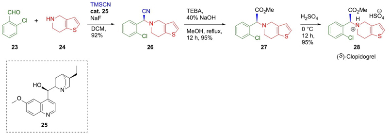 Khan et al. reported a short and original asymmetric Strecker reaction to synthesize (S)‑Clopidogrel (antiplatelet agent) [14]. 2-Chlorobenzaldehyde (23) in the presence of bis-heterocycle 24 as the amine generated in situ an iminium salt, which was trapped by TMSCN. The chiral alkaloid 25 as an organocatalyst was included. The reaction gave a good yield (92 %) and enantioselectivity (er 78:22). A further Pinner reaction with nitrile 26 achieved compound 27, and its acidic hydrolysis afforded the (S)-Clopidogrel (28) (Scheme 5). Authors suggested that the use of NaF as a polarizer of the Si-CN bond facilitated the nucleophilic attack by CN. Coupled with it, it is noted that the use of this kind of organocatalysts made it possible to perform Strecker reactions in enantioselective manner. This was the first time where a Cinchona alkaloid derivative was used in an asymmetric Strecker reaction, in this case occurred a process of dynamic kinetic resolution to generate quantitative yields in one of the enantiomers [15].