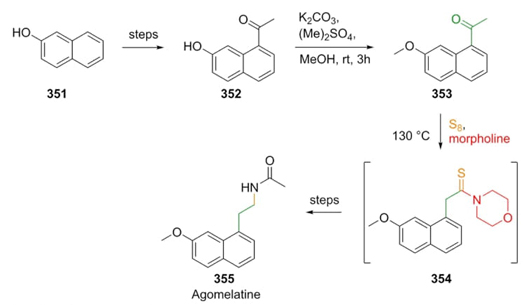 Cherukupally et al. furnished the total synthesis in eight steps of the antidepressant drug agomelatine (355) by a synthetic strategy in which the key step was a Willgerodt-Kindler reaction [69]. The procedure began with 2-naphthol 351, which was transformed into ketone 352. The latter was methylated with dimethyl sulfate in mild basic conditions to give ketone 353. Then, ketone 353, morpholine, and elementary sulfur were converted into thiomorpholide-type intermediate 354 (Scheme 50). Further transformations such as esterification, reduction to alcohol, and hydrogenation completed the synthetic route in 27 % overall yield. The use of a Willgerodt-Kindler reaction in a total synthesis, since this process regularly provides moderate to good yields.
