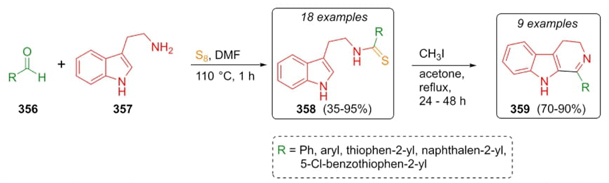 Volk et al. performed the first Willgerodt-Kindler 3CR-based synthetic strategy towards N-thioacyltryptamines 358, and their further transformations into the corresponding β-carbolines 359 (Scheme 51) [70]. Thus, aldehydes 356, tryptamine (357), and sulfur were combined to afford the N-thioacyltryptamines 358 in moderate to good yields (35-95 %). At the same time, a portion of these products were carried to subsequent ring-closure transformations promoted by iodomethane to give β-carbolines 359. In addition, this procedure was furnished using a broad range of electron-releasing and electron-withdrawing groups placed in the aldehydes 356.