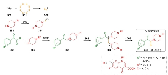 In 2017, Darehkordi et al. performed a rapid route to synthesize novel heterocycles incorporating fragments of antibiotic fluoroquinoline-derivatives such as enoxacine, norxacine, and ciprofloxacine via a Willgerodt-Kindler reaction [71]. Thus, arylglyoxals 365, fluoroquinolones 363, and elemental sulfur were combined sequentially using sodium sulfide in catalytic amounts to reach products 369 in good to excellent yields (83-95 %). The mechanism proposed suggests that Na2S (360) and sulfur (361) allowed the formation of ions 362 that combined with amines 363 gave the anions 364, which perform a nucleophilic attack on iminium ions 367 to achieve the products 369 through a release of amines 363 from the intermediates 368 (Scheme 52). It is worth emphasizing the key role of Na2S (360) in the addition to uncommon amine source and the role of sulfur as an oxidant. Also, this one-pot reaction allowed easily and efficiently incorporation of fluorodihydroquinoline as an antibiotic pharmacophore fragment.