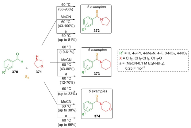 Feroci et al. reported a sustainable method to synthesize thiobenzamides via a Willgerodt-Kindler reaction [72]. Benzaldehydes 370, cyclic amines 371, and elemental sulfur were sequentially combined in three different reaction pathways: under solventless conditions, in solution, and by electrochemical conditions at the same temperature (60 °C) for 3 h to achieve products 372, 373, and 374 (Scheme 53). The yields were varied (up to qualitative yields) due to the variety of substituents in the aromatic aldehydes. Regarding the electrochemical reactions, it is not easy to carry out this type of reactions with electro-attracting groups, but in the case of this methodology, it worked satisfactorily. Also, in electrochemical conditions, formation of tetraethylammonium cations was observed. Low yields were obtained for morpholine-containing analogues probably due to the interactions between oxygen from the morpholine moiety and the sulfur source even though stoichiometric amounts of sulfur were used at low temperatures.