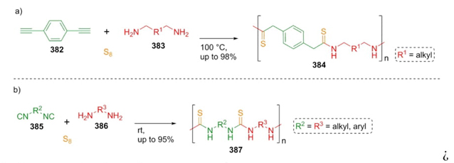 In 2018, Theato et al. published a seminal manuscript in which two types of multicomponent polymerizations via a Willgerodt-Kindler reaction are described [74]. Reaction a) combining dialkynes 382 with aliphatic diamines 383 , and reaction b) using diisonitriles 385 and aliphatic diamines 386. Both reactions were carried out under typical Willgerodt-Kindler conditions and without catalysts, yielding up to 98 % and 95 % for both kind of polymeric products 384 and 387 respectively (Scheme 55).