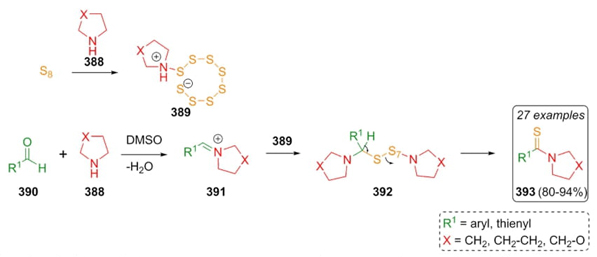 In 2019, Dalal et al. developed a methodology to synthesize thioamides via a Willgerodt-Kindler reaction [75]. Thioamides 393 were assembled by combining aromatic aldehydes 390, cyclic amines 388, and a sulfur source under catalyst-free conditions. The products were prepared in good to excellent yields (80-94 %). Electron-withdrawing and electron-donating groups were included in the substrate scope. A plausible reaction mechanism starting from zwitterionic compounds 389, which were prepared by reacting sulfur and amines 388. Then, zwitterions 389 performed a nucleophilic attack on cyclic iminium ions 391 to give intermediates 392 (Scheme 56). Finally after releasing of sulfur, the products 393 were achieved. The best yields were directed by three important factors: a) nucleophilicity of cyclic secondary amines; b) DMSO as an environmentally friendly solvent; and c) low amounts of sulfur used.