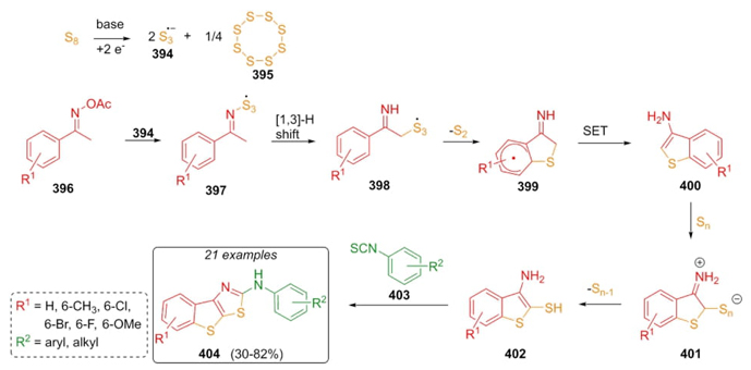 In 2019, Huang, Ji et al. reported an interesting 3CR approach which includes a cascade process under transition metal-free conditions, and employing the Willgerodt-Kindler-type reaction [76].Polyheterocyclic thiazoles 404 were synthesized up to 82 % yield through sequential combinations of ketoximes 396, isothiocyanates 403, and a sulfur source promoted by two bases. A plausible mechanistic pathway suggests formation of a base-promoted sulfur radicals 394 s, which are inserted into ketoximes 396 followed by a [1,3]-H shift in the intermediates 397 to give radicals 398. Then, it was promoted a radical cyclization on compounds 398 to achieve intermediates 399, which after a single electron transfer (SET) performed heterocycles 400, and finally, a Willgerodt-Kindler-type reaction between thiols 402 and isothiocyanates 403 (Scheme 57). Notability, sulfur-assisted cascade process formed trisulfur radical anion 394, which activated compound 396. The base-containing acetates promoted the formation of subproducts. Ketoxime acetates proceed accurately when they are substituted in meta instead of ortho position. On the other hand, other reagents were explored instead of isocyanates such as urea, thiourea, DMF, etc. but those attempts did not proceed.