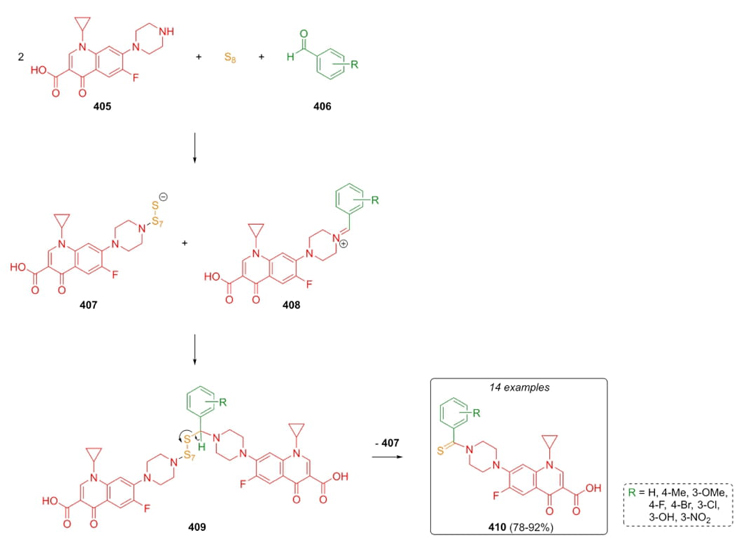 In 2022, Iraji, Mahdavi et al. developed a synthetic procedure to achieve ciprofloxacin derivatives through a Willgerodt-Kindler-3CR, incorporating a pharmacophoric fragment behind the search for potential antibacterial activity [77]. The combination of aromatic aldehydes 406, a couple of equivalents of ciprofloxacin (405), and sulfur allowed the synthesis of ciprofloxacin derivatives 410 in moderate to good yields (78-92 %). A plausible mechanism was proposed (Scheme 58). Condensation of aldehyde and amine-fragment from ciprofloxacin performed iminium ions 408. Besides, nucleophilic attack from sulfur to ciprofloxacin (405) gave the polysulfide anion 407. Finally, a reaction between iminium ions 408 and anions 407 after an oxidation process, ciprofloxacin derivatives 410 were obtained via elimination of ciprofloxacin anion 407 from the precursors 409. It is worth noting that a modest to good antibacterial activity was exhibited by compounds 410 with the ciprofloxacin pharmacophoric fragment included.