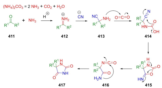 In 1934, H. T. Bucherer reported a mechanism for hydantoin formation which was previously patented by H. Bergs in 1929 [78]. Thus, Bucherer-Bergs reaction is a multicomponent reaction between carbonylic compounds (aldehydes or ketones), a cyanide source (KCN), and ammonium carbonate. The general reaction pathway involves the formation of imines 412, which are attacked by cyanide anions to afford the corresponding aminonitriles 413 followed by a nucleophilic addition to CO2 to furnish intermediates 414. A ring-closing process occurs to give the cyclic compounds 415, which undergo a rearrangement toward formation of isocyanate-type intermediates 416 to finally furnish the hydantoin-based compounds 417 (Scheme 59) [79].