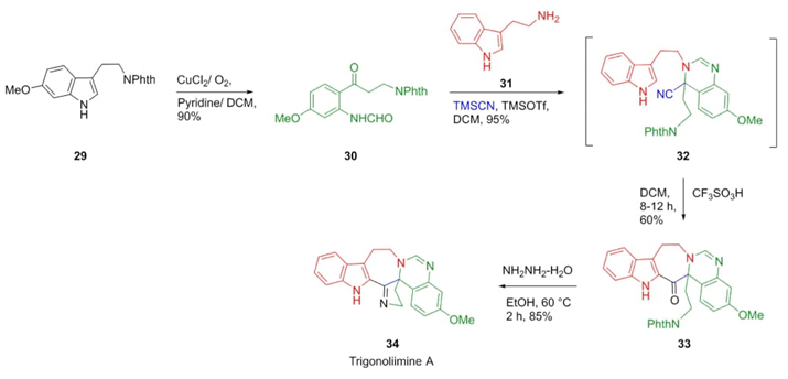 In 2013, Liu, Hao et al. designed an unusual strategy with extreme atom economy towards the synthesis of Trigonoliimine A (hexacyclic bisindole alkaloid isolated from Trigonostemon lii), in which one of the key steps was a Strecker-type reaction [16]. Oxidation of tryptamine 29 gave the ketone 30. Thus, the TMSOTf-catalyzed sequential combination of N-phthaloyl-derivative aldehyde 30, tryptamine (31), and TMSCN gave the Strecker-intermediate 32. Seven-membered ketone 33 was obtained from nitrile compound 32 via Houben-Hoesch-type cyclization in 60% yield. Trigonoliimine A (34) was provided in 85% yield by treatment of seven-membered ketone 33 with hydrazine in ethanol (Scheme 6). It is noteworthy that Strecker reactions with ketones are hard to perform.
