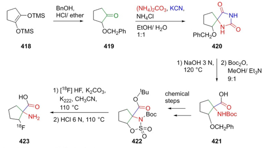 Goodman et al. reported in 2010 the synthesis of an amino acid employed as a tracer in chemotherapy via a Bucherer-Bergs-Strecker reaction as a key step [80]. This tandem-type methodology began with the disubstituted cyclopentene 418. Thus, ketone 419 was treated with KCN, ammonium carbonate, and ammonium chloride to obtain the product 420. After hydrolysis of hydantoin 420 to furnish compound 421 and several further transformations from this latter, precursor 422 was 18F labeled in 39 % radiochemical yield (Scheme 60). In this 3CR, majoritarian product 420 was found to be in a syn/anti (ca. 8:1) stereoselectivity. It was not possible to carry out the direct halogenation in the C-2 position concerning the spiro center in compound 420.