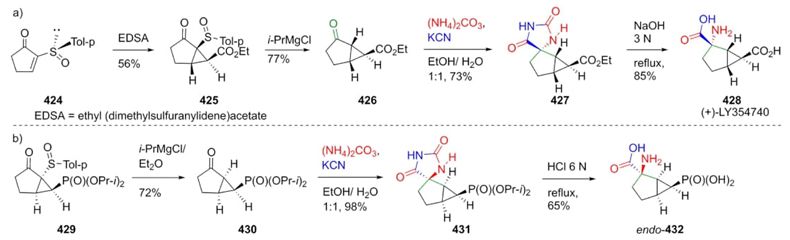 Midura, Mikołajczyk et al. developed a stereocontrolled strategy to prepare compound 428 and its analogue 432 utilizing a Bucherer-Bergs 3CR [81]. Thus, the synthesis of 428 (LY354740) started with the treatment of sulfoxide 424 with ethyl (dimethylsulfuranylidene)acetate (EDSA) obtaining a mixture of diastereomers ent/exo 425. Cyclopentanone 426 was then obtained with by treatment of alcohol 425 with isopropyl magnesium chloride. Then, oxobicyclo 426 was sequentially combined with potassium cyanide and ammonium carbonate to afford the spiro-compound 427. Finally, the synthesis of biomarker 428 was completed through hydrolyzation of its precursor 427 in 26 % overall yield from the sulfoxide 424. To obtain the (+)-LY354740 analogue 432, it was used the same strategy but needing only three experimental steps. From phosphonate 429, sulfur moiety was removed and promoted by isopropyl magnesium chloride to give the bicyclo 430. Thus, applying Bucherer-Bergs conditions to the later compound, the precursor 431 was assembled. Finally, its hydrolysis afforded the product endo-432 in 45 % yields by the three-steps (Scheme 61). In both strategies, a single diastereomer was afforded, where Bucherer-Bergs reaction was the key step.