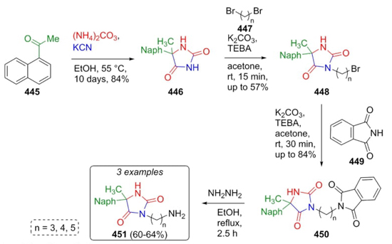 Later in 2015, Handzlik et al. again reported a procedure to achieve some new imidazolidine-4-ones via a Bucherer-Bergs as the key reaction of the process. The products were evaluated as chemosensitizers of S. aureus [83]. The naphthylacetophenone (445) was subjected to a Bergs-Bucherer reaction promoted by KCN and ammonium carbonate to afford the imidazolidine-2,4-dione (446). After two sequential C3-C5 alkylations (the first one on hydantoin 446, and the second one in compounds 448), phthalimides 450 were treated with hydrazine to finally afford products 451 (Scheme 63). Further modifications in N-3 position on the hydantoin ring are expected to potentiate the biological activity of such compounds.