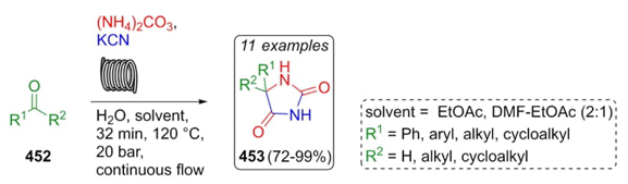 Kappe et al. reported the development of a creative and interesting approach to synthesize hydantoins via Bucherer-Bergs reaction under continuous flow conditions [84]. It was performed a two-feed setup with an organic solution of carbonylic compounds 452 and an aqueous solution of KCN and ammonium carbonate to afford hydantoins 453 in moderate to excellent yields (72-99 %) (Scheme 64). By employing polar solvents like alcohols, an unexpected issue of clogging occurs, which was easily solved by increasing the temperature of the system. However, in the case of alcohols, there is not a correct mixture of phases, so it was necessary to employ ethyl acetate or a mixture of solvents such as DMF-EtOAc in 2/1 v/v proportion.