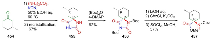 Tanaka et al. developed a new protocol to prepare peptides via the Bucherer-Bergs reaction used to increase annulated amino acids-chains [85]. The first step is just a Bucherer-Bergs reaction starting from chiral ketone 454 to give hydantoin cyclic-derivatives 455 in diastereomeric major product with R, R configuration (Scheme 65). After a separation of diastereomers, pure spiro-compound 455 was N-protected with Boc to give the product 456. Then, it was hydrolyzed with LiOH, and the carboxylate esterified to give the product 457. Stereoselective Bucherer-Bergs reaction is carried out due to steric hindrance between 1,3-diaxial H and C=NH groups. Moreover, it is worth noting that the cyclohexane ring has an axial methyl making a repulsion with to amino esther type group in 457.