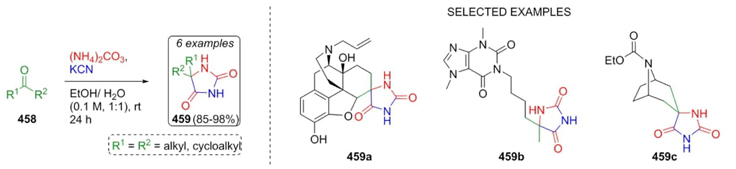 In 2016, Tomohara, Adachi et al. worked on the synthesis of hydantoins from extracts of Curcuma zedoaria via a Bucherer-Bergs reaction [86]. This strategy involved a direct chemical derivatization to synthesize the hydantoins 459. Thus, ketones 458 were combined sequentially with KCN, and ammonium carbonate to afford the products 459 in good to excellent yields (85-98 %) (Scheme 66). In the case of reactions with natural products, at high temperatures, it could produce undesirable compounds or fragmentation of the hydantoin ring in such compounds. On the other hand, it also could be produced other undesirable side reactions if concentrations of reagents are not optimal due to the wide variety of functional groups contained in such natural products.
