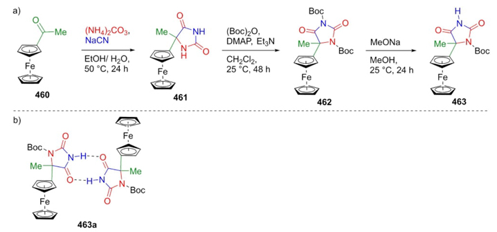 Santi et al. have been focused on the synthesis of aminoacids containing the ferrocenyl-moiety as a metallocene unit to provide H-bonded dimers through the Bucherer-Bergs reaction [87]. Thus, acetylferrocene (460) was subjected to mild Bucherer-Bergs conditions to give the product 461. Then, N-Boc protection was performed under the treatment of hydantoin 461 with (Boc)2O, DMAP, and triethylamine to give the bis-N-Boc-protected hydantoin 462. Finally, compound 462 was combined with sodium methoxide in methanol to afford the product 463 (Scheme 67(a)). Dimerization of hydantoin derivative 463 was carried out in a solution of CDCl3 (Scheme 67(b)). These kinds of compounds are suitable for recognizing cationic species due to the strategic position of the ferrocene fragment.