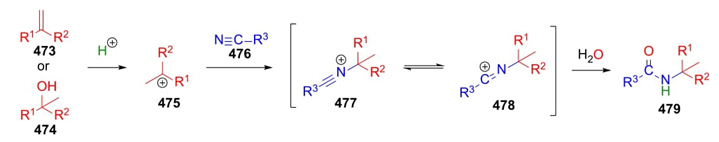 In 1948, John J. Ritter developed a pioneering method to synthesize amides. Formation of carbocations 475 coming from alkenes 473 or alcohols 474 in an acid medium is the first step of this methodology. Then, addition of nitriles 476 furnished nitrilium ion intermediates 477 and their resonance form 478, which in presence of water (or other kind of nucleophiles) finally provide the amides 479, eventually in good to excellent yields (Scheme 69) [89]. Even, Ritter reaction has been used in an intramolecular way to give heterocycles, for instance, lactams and other kind of related aza-heterocycles [90].