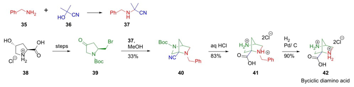 In 2015, Grygorenko et al. continued developing their strategic route called tandem Strecker Reaction-Intramolecular Nucleophilic Cyclization (STRINC) (Scheme 7) [17]. Thus, pyrrolidine-derived γ-bromoketone 39 was synthesized from L-4-hydroxyproline 38 after several chemical steps. After optimization, STRINC process was carried out between ketone 39 and reagent 37, previously generated through a combination between amine 35 and nitrile 36, affording bicyclic aminonitrile 40. Acid hydrolysis of aminonitrile 40 and deprotection of acid 41 completed the synthesis of bicyclic amino acid 42 in an overall yield of 7 % after 10 steps. This one is a peculiar kind of methodology giving good atom economy to develop bicyclic scaffolds.