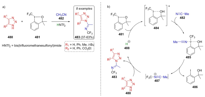 In 2011, Togni et al. developed a Ritter-type reaction to generate compounds with N-CF3 bonds [91]. In this approach, triazoles 480 were combined sequentially with iodine-containing compound 481 in acetonitrile under mild acidic conditions to furnish N-(trifluoromethyl)imidoyls 483 as the main products in modest yields (37-63 %) (Scheme 70(a)). It was proposed a plausible catalytic mechanism, where protonated iodine-containing compound 481 and acetonitrile 482 gave the complex 485. Then, nitrilium ion 487 was formed through a reductive-elimination step. Imines 483 were constructed by a reaction between triazoles 480 and ion 487. Finally, it was released a proton to complete the catalytic cycle (Scheme 70(b)). This strategy allows the formation of a N-CF3 bond since regularly it was formed through another kind of methodologies. Two by-products were formed due to stereoelectronic nature of reactants. For instance, an excess of triazole 480 promotes a trifluoromethylation process, while an excess of iodaoxole (481) produces a Ritter addition of nitrile, which was controlled by stoichiometric quantities of the corresponding reactants 480 and 481.