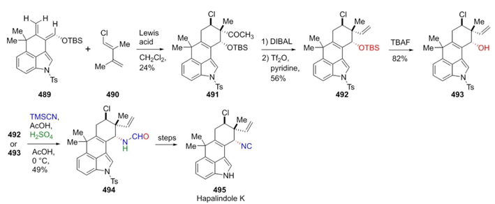 Johnston et al. reported in 2011 the total synthesis of Hapalindoles K, A, and G in twelve steps where a Ritter reaction was the key one [92]. Starting reagents 489 and 490 were previously synthesized. Thus, it was performed a Diels-Alder cycloaddition between them (489 and 490) to give the compound 491, which was reduced with DIBAL to provide alkene 492. This latter was treated with TBAF to obtain the alcohol 493. Then, reagents 492 or 493 were subjected to acidic Ritter conditions with TMSCN affording the compound 494 in good stereoselectivity. After several chemical steps, the synthesis of hapalindole K was completed (Scheme 71). It is noteworthy that Ritter reaction was useful for stereoselective formation of a C-N bond.