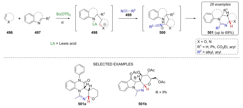 In 2012, Lavilla et al. developed a unusual multicomponent approach through a tandem Mannich-Ritter-type strategy [93]. Thus, unsubstituted compounds 496 and imines 497 were sequentially combined with nitriles 499 to afford products 501 in yields up to 69 % under Lewis-acid catalytic conditions at room temperature. Plausible mechanism comprises the formation of Mannich-type intermediates 498 from olefine and imine reagents, followed by the addition of nitriles to give the Ritter-intermediates 500. Finally, amidines 501 were furnished by means of an intramolecular C-N bond formation (Scheme 72). As first step, it was proposed that cyclic compounds 496 and imines 497 react via Povarov reaction but, it was observed a high ring strain in that intermediate formed so that the mechanism pathway was directed to run via a Mannich sequence. This reaction works well with some restrictions: a) it was necessary to carry out the reaction using an excess of nitriles; b) some compounds such as dimethylindolenine do not perform MCR due to steric hindrance; c) other products with poor yields were the aromatic imine derivatives which were epimerized; d) it was used different N-olefins such as lactams, enamides or thiazolones, which afforded Mannich-type products.