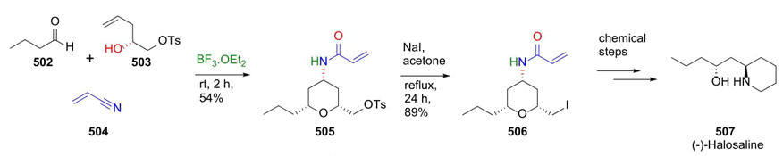 Yadav et al. reported in 2013 a creative three-component procedure involving a cascade Prins-Ritter process as a key step to synthesize tetrahydropyranes as precursors of anti 1,3-aminoalcohols [94]. To demonstrate the effectiveness of this approach, it was achieved the total synthesis of (-)-Halosaline. Chiral alcohol 503 was previously prepared starting from epoxides through Jacobsen’s hydrolytic kinetic resolution followed by a protection. Thus, aldehyde 502, alcohol 503, and nitrile 504 were sequentially combined using a Lewis-acid as catalyst to give product 505, which was treated with sodium iodide to give acrylamide 506. Eight steps from compound 506 were performed, some of them were a ring closing and alkene reduction to complete the total synthesis of (-)-Halosaline (507) (Scheme 73). After MCR, substituents found in equatorial position allowed stereocontrol behind the synthesis of anti-1,3-aminoalcohols, which can be further functionalized.