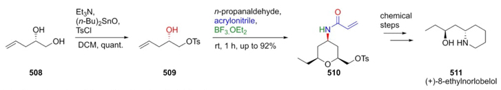 In 2013, Reddy et al. completed and reported for the first time the total synthesis of the alkaloid (+)-8-ethylnorlobelol (511) via a multistep strategy in which a Prins-Ritter cascade reaction was the key process [95]. Synthetic procedure began with the chemoselective protection of dialcohol 508 with tosyl group selectively in the primary alcohol affording product 509. Combination of secondary alcohol 509 with n-propanaldehyde and acrylonitrile under Lewis acid catalysis resulted in the formation of cis-diastereomer of tetrahydropyran 510. Total synthesis was completed in ten steps with high diastereoselectivity (Scheme 74). In the same way, the stereoselectivity key feature was directed since the cascade multicomponent process.