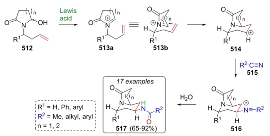 Saikia et al. developed an interesting tandem sequence via an aza-Prins reaction coupled with an intermolecular Ritter reaction to give azabicyclic species 517 [96]. Previously, it was prepared starting reagents 512. Thus, lactams 512 were mixed with nitriles 515 under Lewis acid catalysis to achieve azabicyclic products 517 in good to excellent yields (65-92 %) and with high diastereoselectivity. It was suggested a plausible mechanism where iminium ions 513 were promoted by a Lewis acid. Then, carbocations 514 in chair-like favored conformation lead trapping nitriles 515 affording nitrilium ions 516, which were hydrolyzed completing the synthesis of products 517 (Scheme 75). It was observed that Lewis acids have a favorable effect on the yields and diastereoselectivity, better than Brønsted acids. Also, yields of this MCR depend directly on substituents from the allylic chain, giving the best yields to electron-withdrawing groups. Endo-trig cyclizations of compounds 513 were carried out in axial substitution due to steric hindrance between substituents R1 and carbonyl group from N-acyliminium ions as well as strong ring strain.