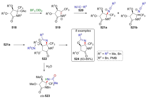 The synthesis of new pyrrolidin-2-ones reported by Grellepois, Ben-Jamaa et al. involved a diastereoselective Ritter-type reaction [97]. The first step was the formation of N-acyliminium ions 519, which were trapped by nitriles 520 affording isomeric mixtures of nitrilium ions 521a and 521b. Then, two routes continued from isomers 521a: 1) cis-nitrilium ions 521a promoted the synthesis of oxazolines 524 in 63 to 89 % yields through intermediates 522, and 2) hydrolysis of intermediates 522 allowed the formation of cis-amides 523 (Scheme 76). These MCRs were carried out under Lewis acid conditions. During the processes, side products like amides or a diastereomeric mixture of products were obtained due to the presence of water in reaction media, which was solved using adequate quantities of acetonitrile to obtain 521a as the major products. In contrast, compounds 521b were obtained as by-products.