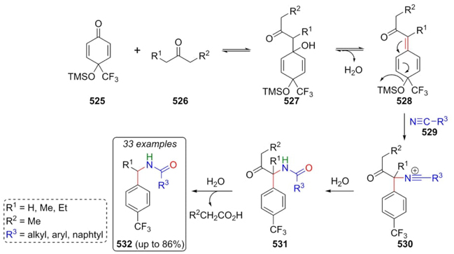 Li, Liu et al. developed an interesting method for preparing N-benzyl amides 532 through a cascade Ritter-type reaction [98]. In this process, the enolic form of ketones 526 performed a nucleophilic attack on carbonyl compounds 525 generating the intermediates 527. Dehydration of these later affords intermediates 528, which were trapped by nitriles 529 gave the nitrilium ions 530. Thus, after their hydration to give compounds 531, the elimination of leaving group completed the synthesis of p-(trifluoromethyl)benzyl amides 532 in up to 86 % yields (Scheme 77). As seen, best yields were obtained using dichloroethane as solvent, and TMSCl as Lewis acid catalyst, and water as an additive. In particular, the addition of water promoted hydrolysis of acyl group. Regarding to nitriles, multisubstituted benzonitriles do not promote reaction due to steric hindrance. On the other hand, benzonitriles substituted in ortho or para position decrease considerably the yields due to electronic inductive effects. A variety of electron-donating and electron-deficient groups were used in this approach, which indicates the viability of this process.