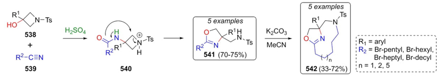 An elegant methodology developed by Baxendale et al. towards the synthesis of the new and complex macrocycles 542 involved a Ritter-type reaction as the first step of such procedure [100]. To achieve oxazolidines 541, Ritter conditions from alcohols 538, nitriles 539, and sulfuric acid afforded amides 540, where the oxygen of the amides attacked the ring releasing the ring strain to give the products 541. With 4,5-dihydrooxazoles 541 in hands, compounds 542 were synthesized via intramolecular cyclizations in basic conditions (Scheme 79). The corresponding Ritter-intermediates were not formed in this approach. Moreover, in this strategy, several acids were evaluated, sulfuric and fluoroboric acids were the best ones, where sulfuric acid was chosen for its economy and ease of access. On the other hand, authors examined solvent effects in chloroform, dichloromethane, toluene, xylene, among others; DCM was selected as the best one.