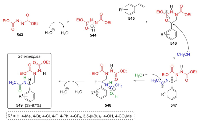 Bao et al. reported in 2021 the synthesis of vicinal diamines 549 via a Ritter-type multicomponent reaction [101]. The optimal reaction conditions were using the strong Brønsted acid HPF6, and Cu(CH3CN)4PF6 as catalyst . Diethyl azodicarboxylate (543) and styrenes 545 were mixed to achieve the corresponding products in moderate to good yields (39-97 %). Authors proposed a plausible reaction mechanism, that was supported by DFT calculations. Thus, azodicarboxylate (543) was protonated by a Brønsted acid to assemble the intermediate 544, which in the presence of styrenes 545 afforded carbocations 546. Finally, products 549 were obtained following a Ritter reaction route after a nucleophilic attack of acetonitrile to intermediates 546, and the addition of water to carbocations 547 and dehydration of intermediates 548 (Scheme 80). Acetonitrile not only worked as the solvent but also contributed to the multicomponent process as one of the three reagents. Electronic effects influenced the yields because in the substitution from compounds with electro-donating or electro-withdrawing groups, the ortho or meta positions in the aromatic moiety gave the best yields, whereas in the para position, the yields were lower. In addition, the yields are affected by the amount of Brønsted acid used.
