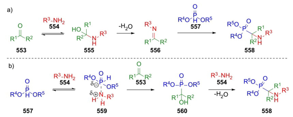 Another multicomponent reaction was developed in 1952 by Martin I. Kabachnik and Ellis K. Fields. This 3CR involves a reaction between carbonylic compounds (usually aldehyde but, a few examples using ketones have been reported), an amine, and a dialkyl phosphite [103]. The mechanism may take two pathways depending on the nature of reagents and mainly of the order of addition: a) condensation between carbonyl compounds 553 and amines 554, followed by addition of P-H anions 557 to the corresponding imines 556 to complete the synthesis of phosphonates 558; or b) addition of phosphites 557 to amines 554 to afford phosphonate complexes 559. Then, zwitterions 559 are mixed with carbonyl compounds 553 to achieve compounds 560, which through a condensation with amines 554 furnish products 558 (Scheme 82(a),(b)) [104].