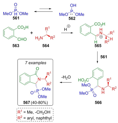 Ordóñez et al. developed a synthetic methodology based on the Kabachnik-Fields three-component reaction to synthesize a few isoindolin-1-one-3-phosphonates [105]. Thus, condensation between aldehydes 563 and amines 564 afforded iminium ions 565, which were nucleophilically attacked by phosphites 562. After a dehydration process, products 567 were obtained under solvent and catalyst-free conditions (Scheme 83). It must be noted that the determinant step that allowed the high degree of diastereoselectivity is the nucleophilic attack of phosphites to imines due to a less hindered attack in re-face.